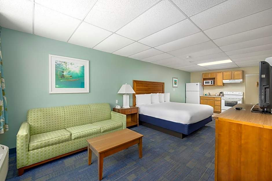This studio features a private balcony or patio with a gulf view and a sofa bed. It includes a microwave, small refrigerator and a single-serve coffee machine.