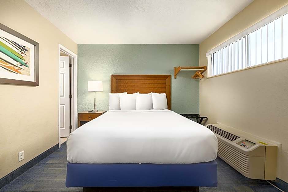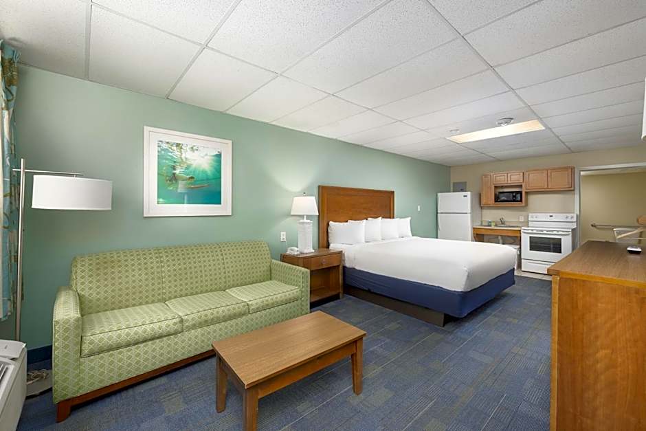 This room features a private balcony or patio with a gulf view. It includes a microwave, small refrigerator and a single-serve coffee machine. Accessibility features include a toilet with grab bars and an adapted bath with grab bars. The entire unit is wheelchair accessible.